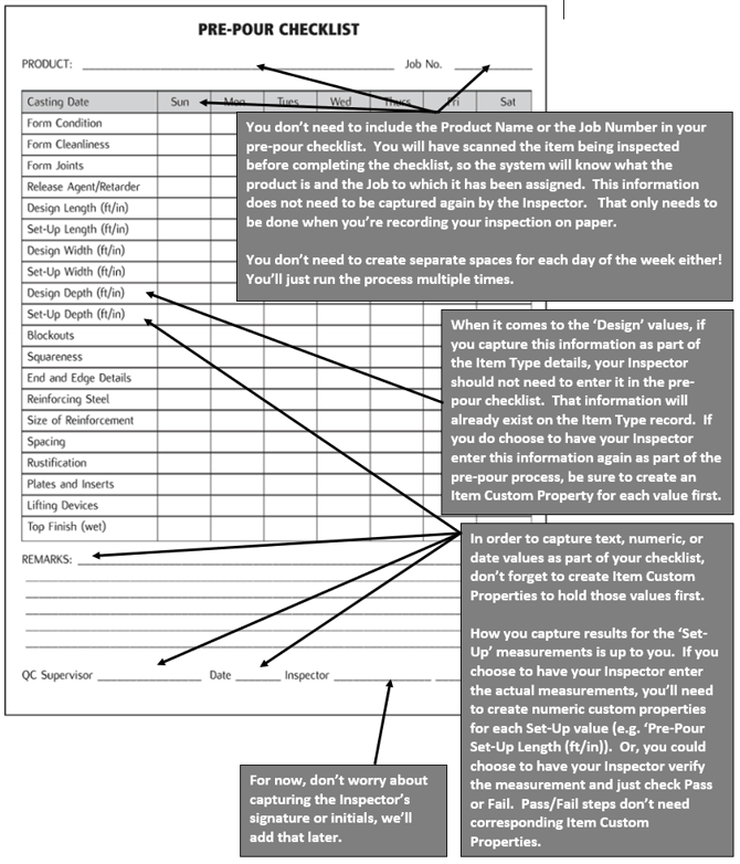 After seeing your Inventory process in action, she wants you to create electronic versions of each of your company's QC processes. First up, the pre-pour inspection. Below is a copy of the pre-pour inspection checklist your QC inspectors use. You need to create an electronic version of this form in Idencia.